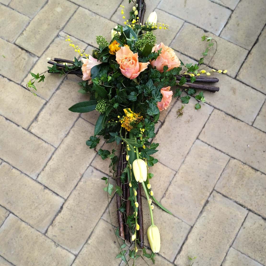 Dette grenkors binder vi af naturmaterialer. Korset bliver ved hver bestilling bundet af udvalgte grene, pinde og planter. De vælges nøje, så det tilpasses dit farvevalg af afskårne blomster for den bedste harmoni i binderiet. Korset bliver pyntet med planter og blomster i sæson.