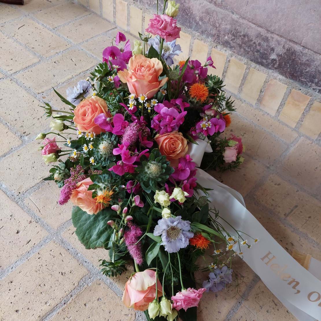 En elegant hilsen hvor blomsterne er arrangeret med højde og længde og kan sende sende en masse kærlige tanker på en sørgeligdag.