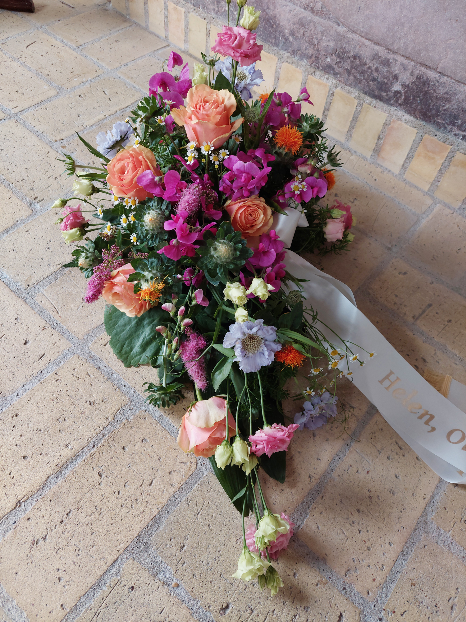 En elegant hilsen hvor blomsterne er arrangeret med højde og længde og kan sende sende en masse kærlige tanker på en sørgeligdag.
