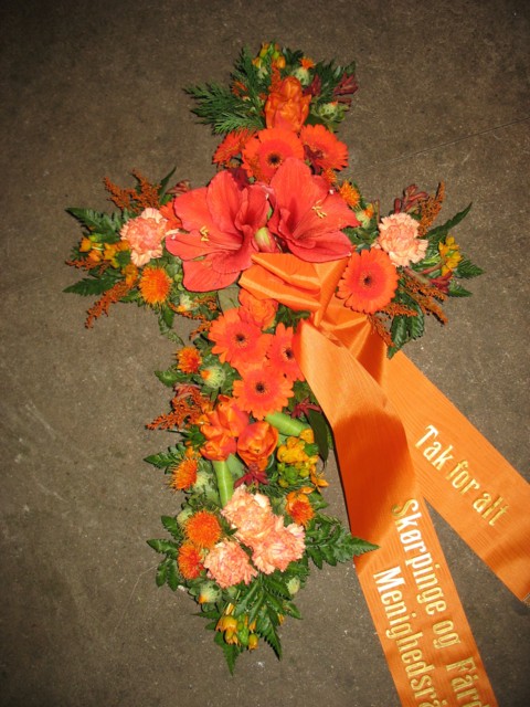 Et kors er et meget stærkt og fint symbol til en begravelse eller bisættelse. Her med farvet bånd, som får det hele til at passe så fint sammen.