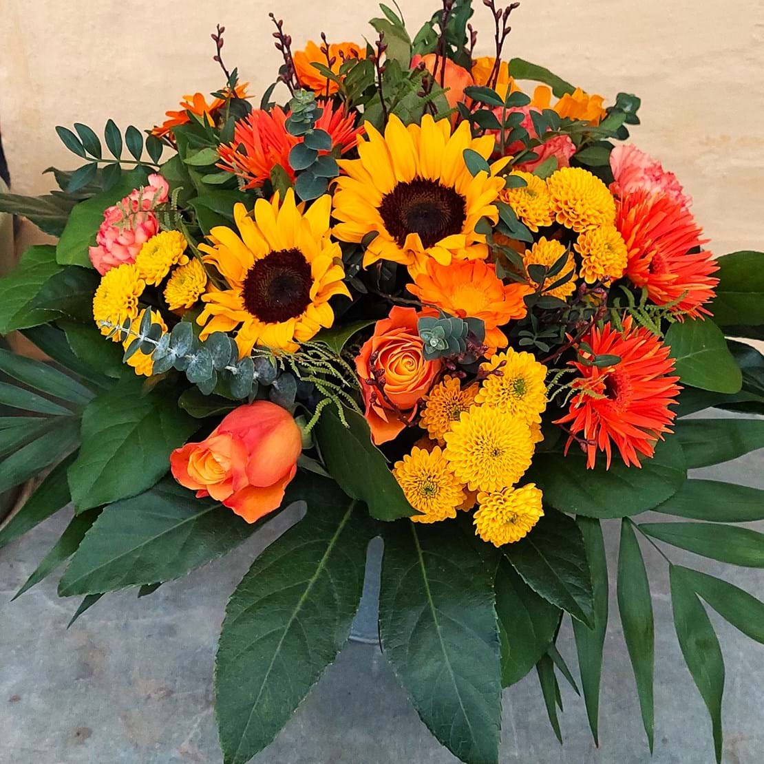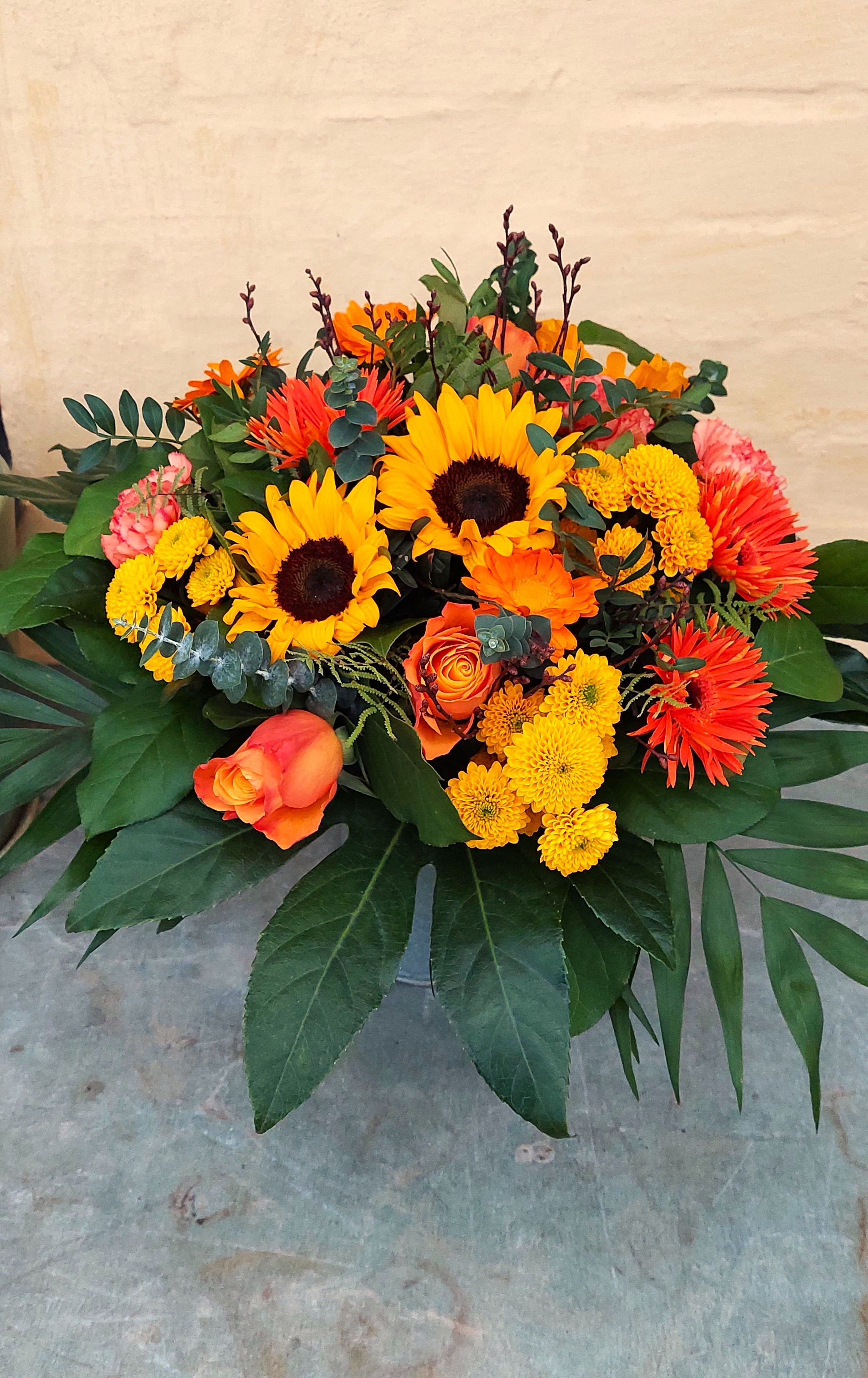 I en lav tæt buket er der primært brugt store blomster, som roser, germini, dianthus , hvor hovederne er i fokus, og pænt afsluttet med en bladkrans.