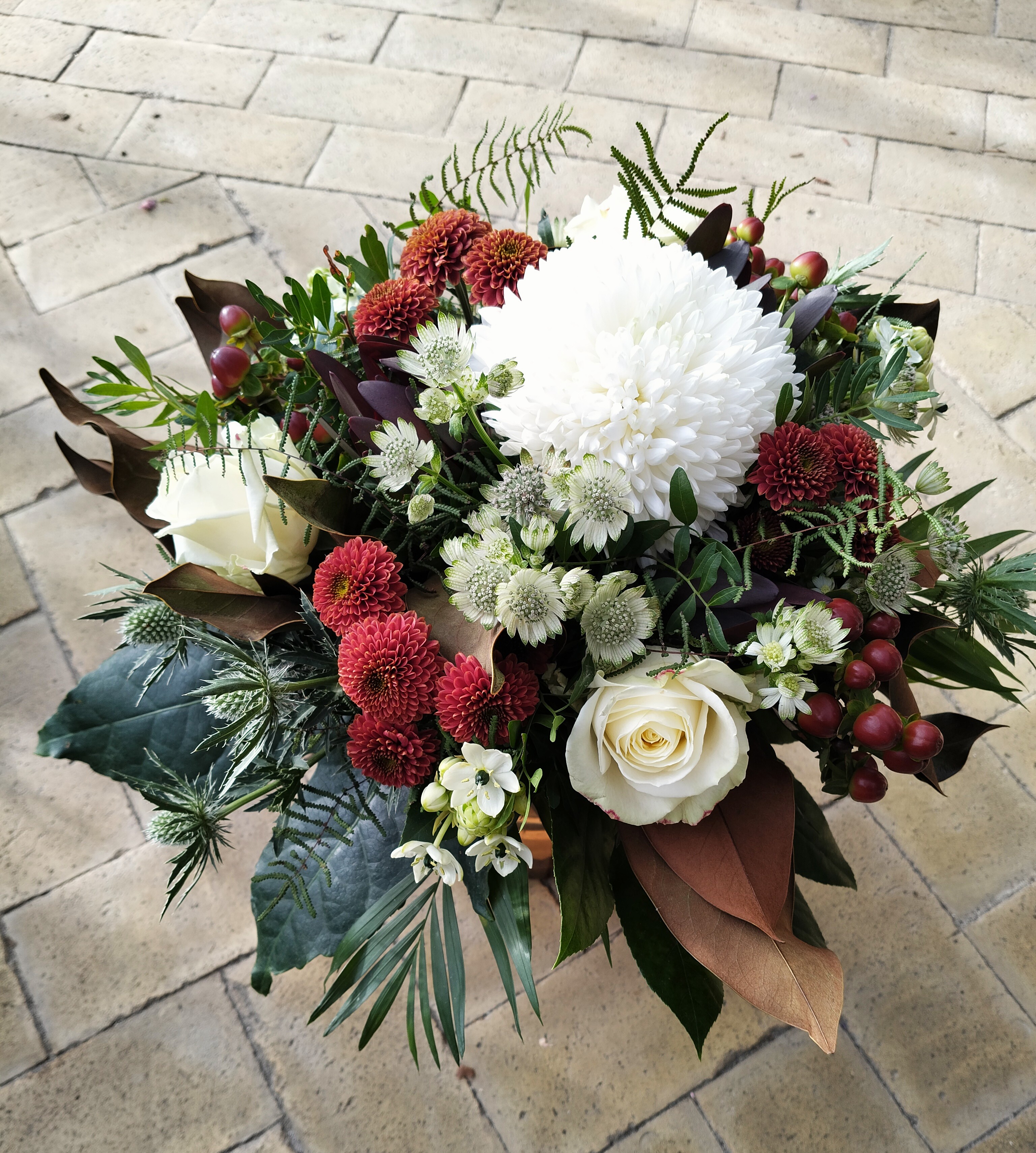 Der er noget særligt over November månedens flotte farver. Denne buket emmer af efterår og de varme rødlige nuancer harmonerer smukt med de lyse blomster.