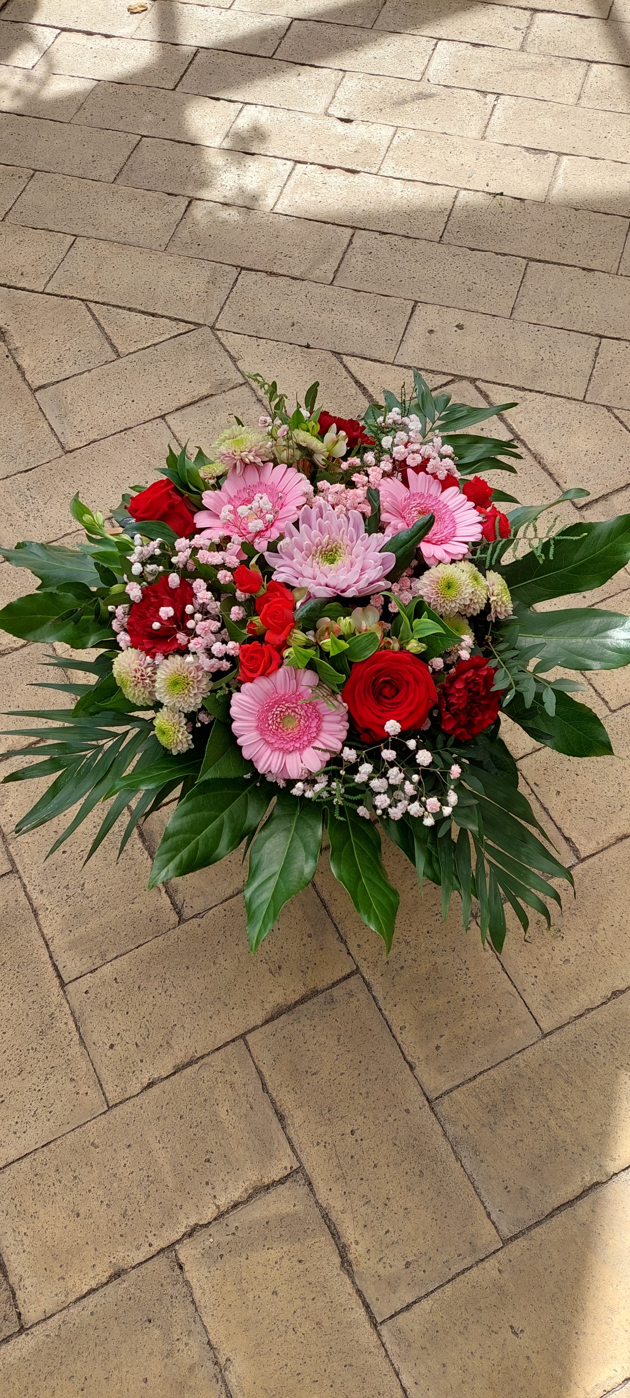En traditionel buket i rød - lyserød med roser, brudeslør og andet sødt.