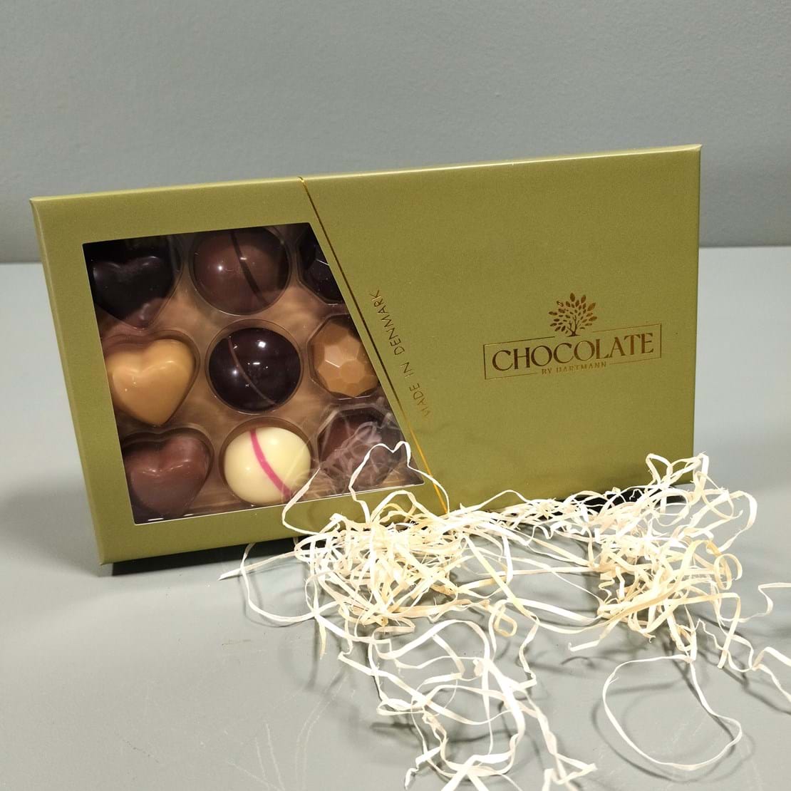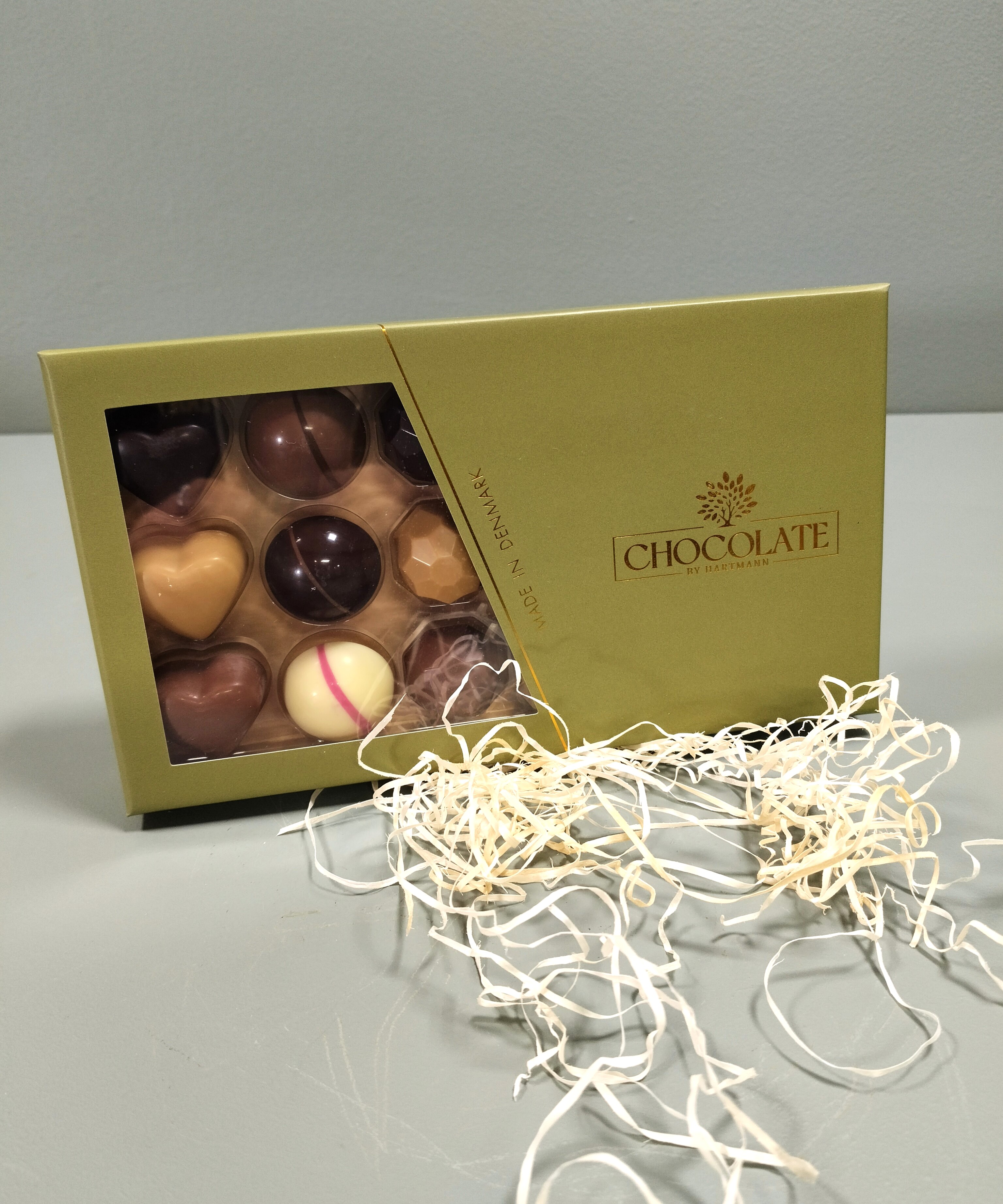 Er du klar på 18 forskellige smagsoplevelser af det reneste chokoladehåndværk! Denne æske består af 18 fyldte chokolader, der tager dig igennem en perlerække af smage. Orange fondant, Mørk salt karamel, Mint karamel, Praline, Solbær, Passionsfrugt, Pistacie nougat, Hindbær ganache, Lys salt karamel, Valnød praliné, Hindbær karamel, Gianduja nougat, Salt karamel, Jordbær, Kaffe/cognac-karamel, Mælk Praliné, Citron ganache og Rom.