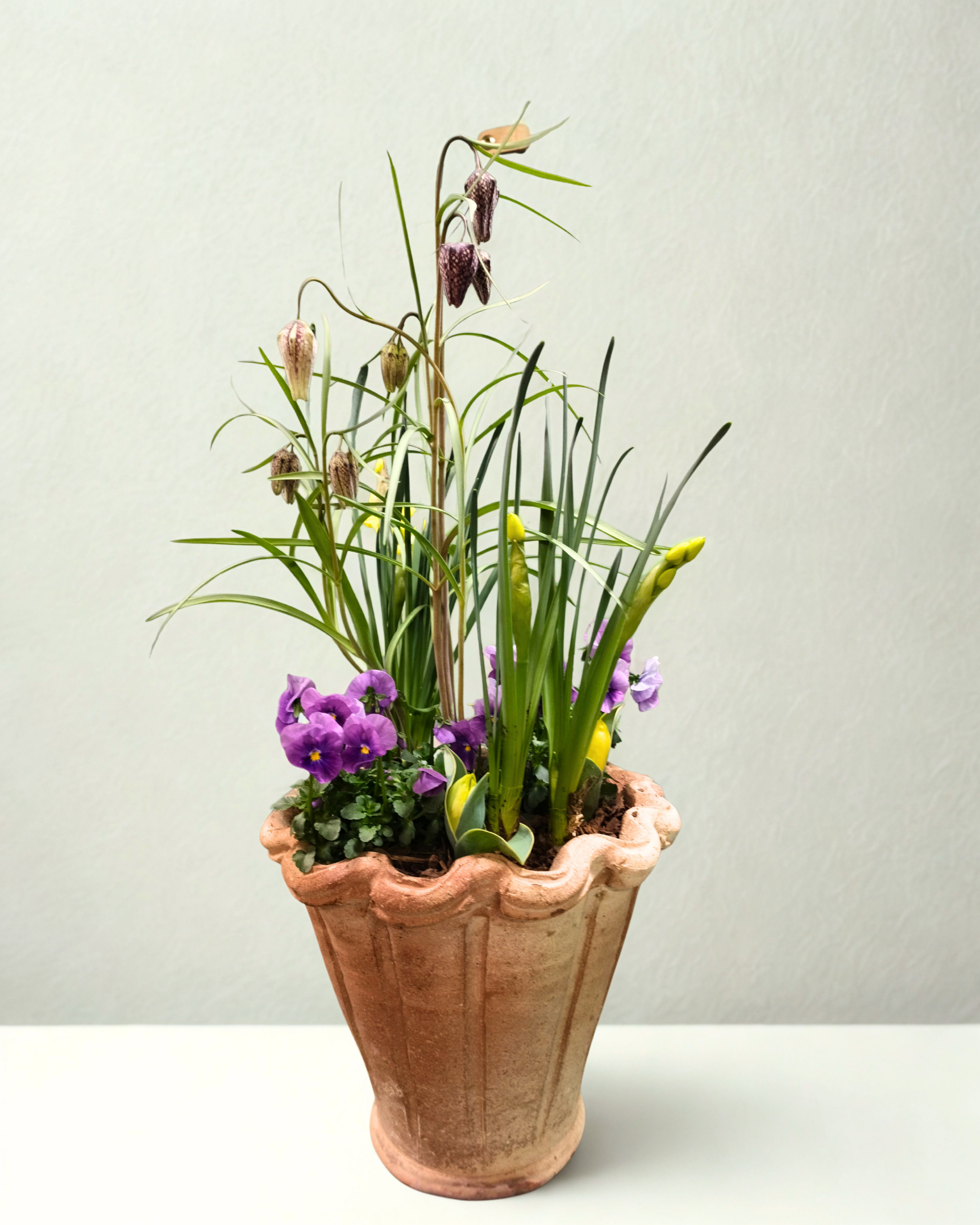 En smuk og naturlig sammenplantning i krukke, der kombinerer sæsonens udtryk med et let og elegant design. Sammensætningen er skabt med fokus på variation i form, højde og struktur, hvilket giver et levende og harmonisk helhedsindtryk.
